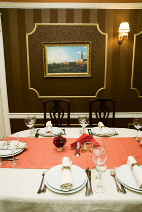 - На выделенной площади (80 м) мы организовали два небольших зала в стиле бидермейер (упрощенный ампир). Это дворянский стиль небольших усадеб на окраине Петербурга, получивший развитие в начале XIX века, - рассказывает Валерий Белолипецкий, архитектор проекта. – Таким образом, нам удалось интерьер VIP-зоны связать с пушкинским временем, воплотив атмосферу дворянского гнезда, чего и требовала концепция ресторана. Хотя это, конечно, была в некотором роде авантюра: отказаться от русского стиля, который был взят за основу при оформлении большого зала, и выбрать более дорогой и торжественный.