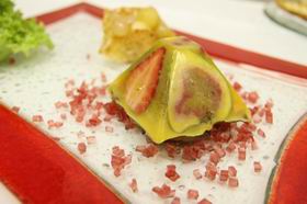 1. В полусладкое красное вино Сотерн добавить желатин, влить в лист и поставить в холодильник до застывания.
