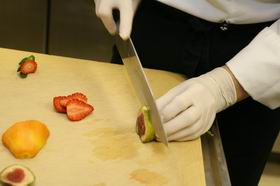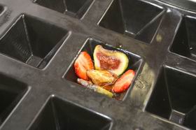 4. На дно формочки положить 3 ягоды красной смородины, а по бокам - по 2 слайса свежей клубники и инжира.