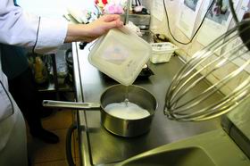 3. Яйца с сахаром прогреть на водяной бане, перемешивая, а затем взбить до пышной массы.