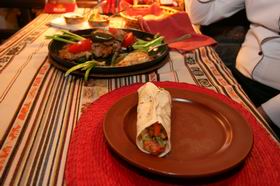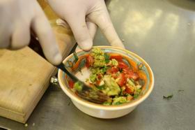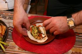 9. В лепешку кладутся по кусочку мяса, овощей и ложке соуса Гуакамоле и сметаны. Все заворачивается - и можно есть.