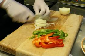 3. Вытащить из горячей духовки чистую сухую сковороду (в ней блюдо будет подаваться гостю) - она должна быть горячей. Поставить ее на плиту, положить в нее подготовленные полоски перца и соломку лука (без масла!) Не солить, не перчить - просто перемешать.