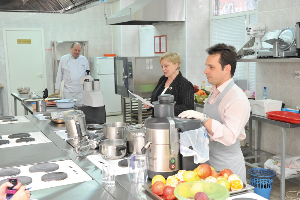 А затем началось самое вкусное. Повар-консультант Компании «Торговый Проект» Валерьян Антонов и бренд-менеджер московского представительства компании Robot Coupe (Франция) Юрий Опарин наглядно продемонстрировали собравшимся, что диетические блюда в школьной столовой — вполне реальная вещь. При составлении «меню дня» был сделан упор на простые ингредиенты, легкость и технологичность приготовления, а также сохранение в продуктах всех полезных свойств. Вместе с тем блюда должны быть привлекательны для самых притязательных «конечных пользователей» — подростков. В качестве «подопытных» выступили присутствующие учащиеся лицея.