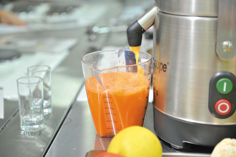 При помощи новинки Robot Coupe, универсальной соковыжималки J80 Ultra, были приготовлены свежевыжатые овощные, фруктово-овощные и фруктовые соки. С помощью кухонного процессора R301 Ultra, совмещающего в себе куттер и овощерезку, за 5 минут был создан легкий овощной салат на 30 порций. Следует отметить простоту использования овощерезки и высокое качество нарезки продуктов. Затем на R301 с использованием специальной насадки в считанные секунды сделали традиционное картофельное и необычное морковно-картофельное пюре.