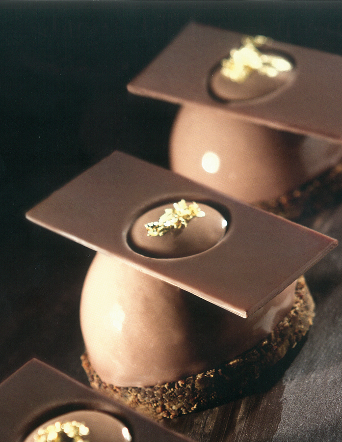 Собрать пирожное. В шар с шоколадным муссом диаметром 5 см добавить замороженный шар с ванильным кремом диаметром 3,5 см и вновь все заморозить. Выпеченное тесто Шу заполнить мармеладом. Замороженные шары покрыть золотым глясажем и выложить их на тесто Шу. Украсить шоколадным декором.