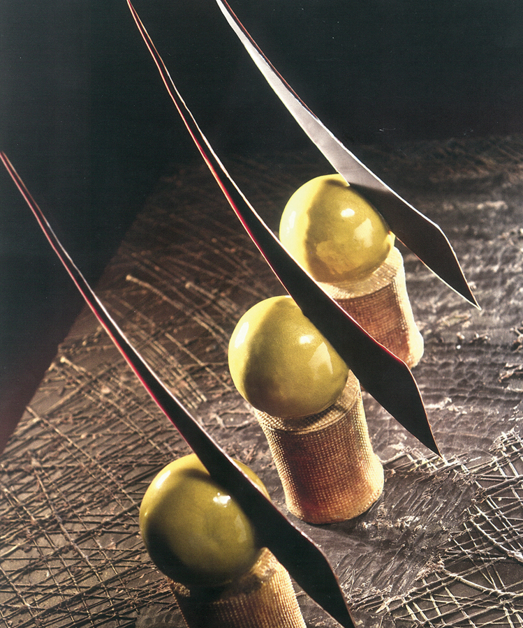 Для крема зеленого лимона подогреть пюре лимонов. Добавить смесь целых яиц, яичных желтков и сахарного песка. Помешивая, довести до кипения. Снять с огня и добавить желатин, а потом — сливочное масло. Все взбить миксером. Вылить смесь в формочку полушара диаметром 4 см и заморозить.