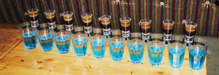 В десять рюмок поочередно налить по 10 мл кокосового сиропа, черносливового ликера, дынного ликера, черного рома, сока лимона и абсента, тщательно следя, чтобы слои не перемешались друг с другом.