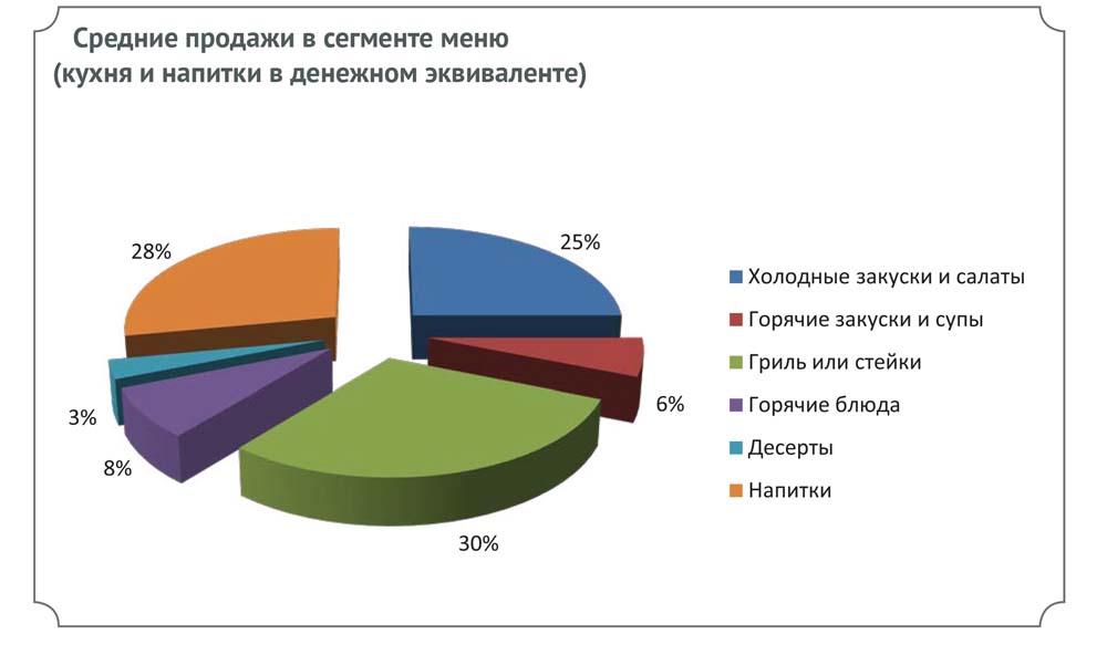 Заключение о прибыли мясного ресторана сделал по результатам продаж в своём заведении управляющий партнёр сети московских ресторанов «Торро Гриль» Кирилл Мартыненко: см. диаграмму «Средние продажи в сегменте меню (кухня в денежном эквиваленте)». Из неё понятно, что в мясное заведение гости приходят, прежде всего, чтобы съесть «чистое мясо» — стейк или мясо на гриле — с салатом. Если смотреть продажи не только по кухне, но и по напиткам, то будет видно, что напитки по продажам опережают салаты — см. диаграмму «Средние продажи в сегменте меню (кухня и напитки в денежном эквиваленте)».