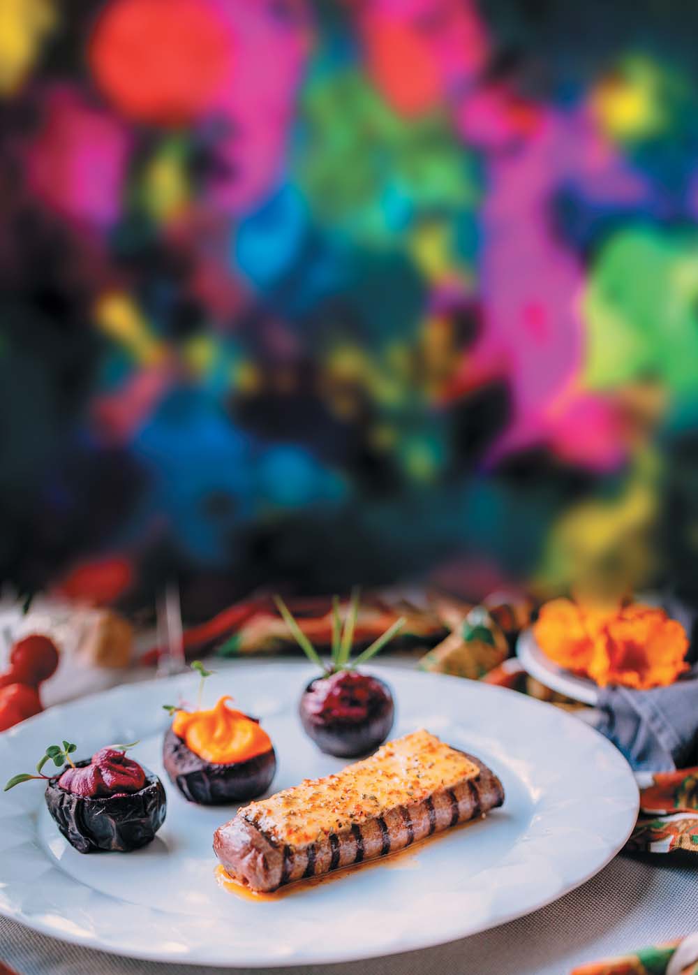 При подаче поставить две свёклы на тарелку, рядом положить стейк. На оленину положить масло, опалить его горелкой. Украсить мини-ростками свёклы.