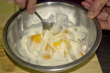 Тыкву свежую очищенную нарезать ровными треугольниками или кубиками (по 3-4 штуки на порцию) и припустить в небольшом количестве воды с добавлением сахарного песка до готовности (не переварить). Остудить и обсушить от излишней влаги.