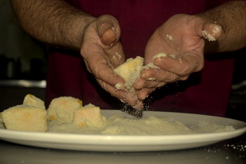 Каждый кусочек припущенной тыквы при помощи деревянной шпажки обмакнуть в тесто и обвалять в белой панировке, приготовленной из свежего батона без корок (при необходимости можно сделать двойную панировку). Панированные кусочки тыквы обжарить во фритюре до золотистой корочки. Подавать прямо со шпажками.