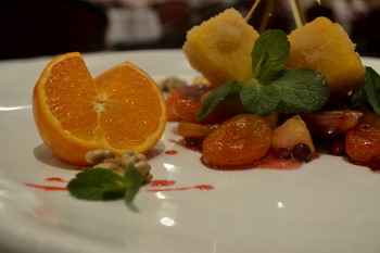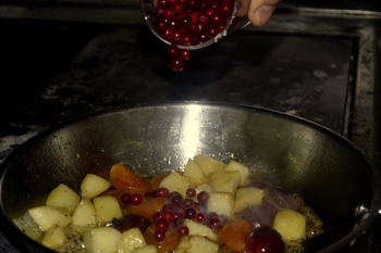 Яблоко свежее очистить от семян и кожицы, нарезать средним кубиком и слегка обжарить на небольшом количестве растительного масла. Добавить мед, специи, курагу (при необходимости замоченную), виноград и протушить на медленном огне до уваривания излишней жидкости. За 3-4 минуты до готовности добавить свежемороженую бруснику и дольки очищенного грецкого ореха.