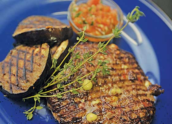 Баклажан порезать поперек, 3-4 кружка обжарить на сковороде гриль параллельно с плескавицей, посолить, поперчить, полить оливковым маслом, посыпать чесноком и также выложить на тарелку.