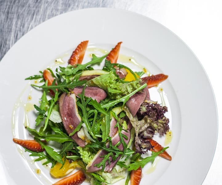 На круглую тарелку выложить филе апельсина, сверху — листья салата с уткой и ананасом, украсить дольками клубники.