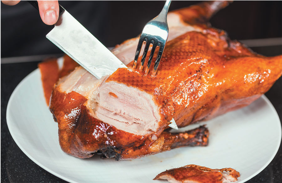 — У нас есть разные подачи. Красивую глазированную утку всегда выносят целиком, показывают гостям, и официант её разделывает. Он может в присутствии гостя завернуть блинчики с начинкой из утки, лука и огурца и соусом хойсин, но в последнее время пользуется популярностью другая подача — когда официант разделывает утку и ставит её гостям в стол. Блинчики и все компоненты к ним подаются отдельно. Гости словно сами создают театр и приобщаются к искусству разделки утки… Все ингредиенты звучат в унисон, дополняя и оттеняя друг друга. Такое блюдо, как говорили китайцы, пробудит аппетит и у сытого, и у спящего.