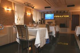 Воздушный, прозрачный, главный ресторанный зал на 2 этаже – сердце «Манилов cafe» - светел и легок. Свету вообще уделено здесь пристальное внимание. Голубая подсветка выделяет не только барную стойку, она оформляет каждый столик. А великолепная люстра из тысячи хрустальных капелек, тянущаяся по всей длине потолка, вообще заставляет замереть каждого входящего. Люстру ручной работы в разобранном виде везли из Италии и уже на месте собирали по капелькам.