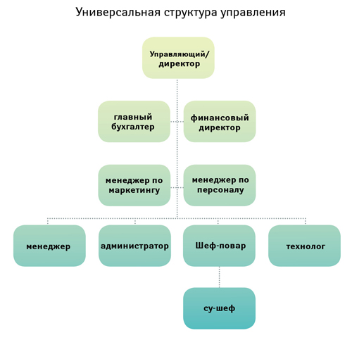 Но кто же отвечает конкретно? Конечно, рестораны все разные, везде по-своему построена система управления. Тем не менее, существует некая универсальная структура, дающая понимание того, кто же в дальнейшем будет выполнять те или иные функции. Схематично ее можно обозначить таким рисунком (см. рисунок «Универсальная структура управления»).
