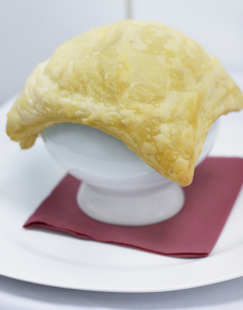 Один из классических супов, представленных в ресторане «На Елисейских полях», — французский луковый суп. Он варится на белом вине и курином бульоне. Правда, повар выбрал оригинальную подачу: вместо гренок суп подается под шапкой из слоеного теста, запеченного с сыром Пармезан. Для этого супа очень важно сделать удачный выбор белого сухого вина: его испортит и слишком дорогое, и тем более слишком дешевое вино. На одну бутылку уходит 1,5-2 килограмма лука.