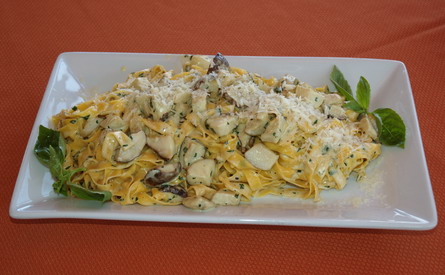 Вынуть пасту, переложить в вок к грибам в сливках.