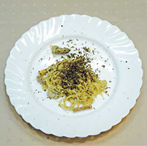 Выложить на блюдо, посыпать натертым черным пьемонтским трюфелем.