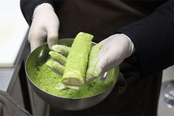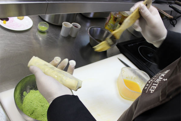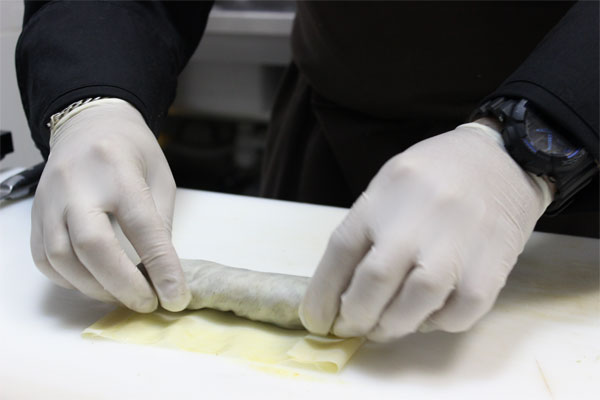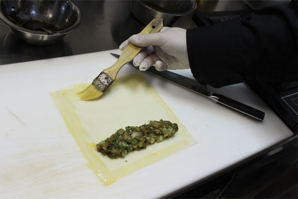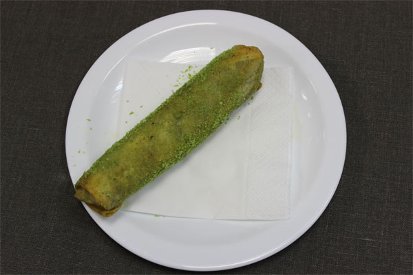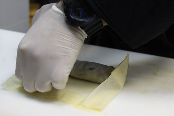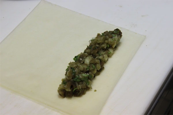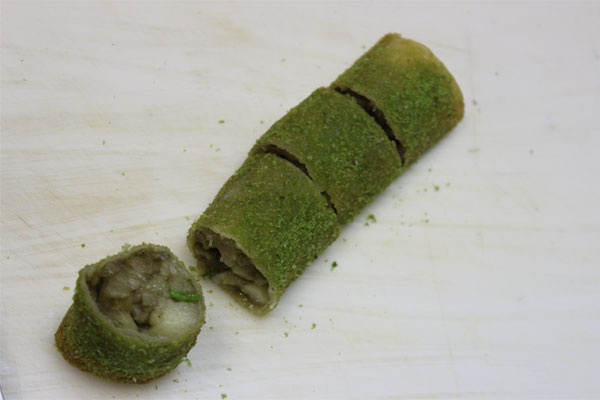Получившийся баклажановый фарш завернуть в тесто для спринг роллов в виде трубочки, смазать льезоном и обвалять в сухарях с зеленью. Пожарить во фритюре до готовности. Перед подачей нарезать.