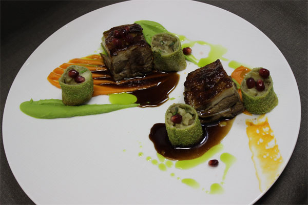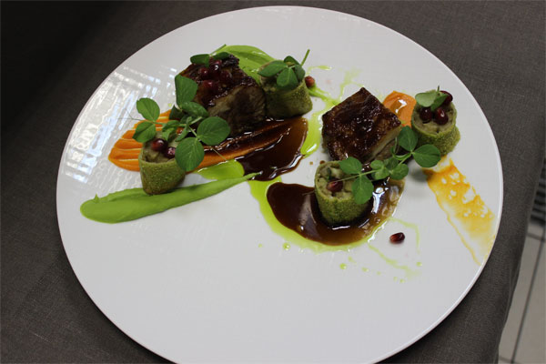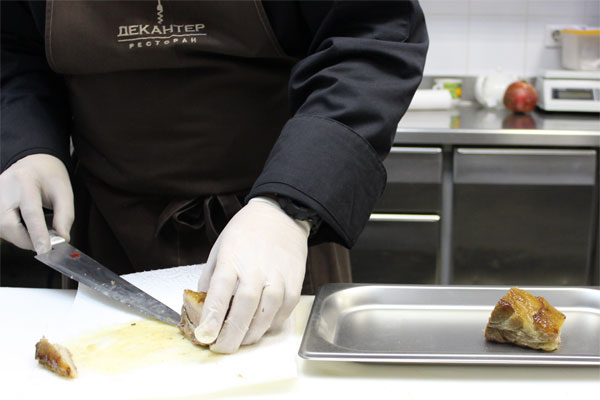 Для соуса: выпарить красное вино с наршарабом, добавить «деми глясс», тимьян и довести до вкуса.