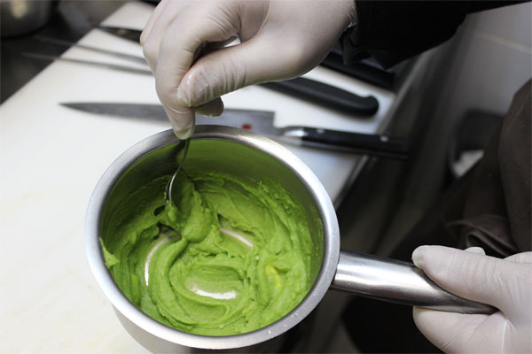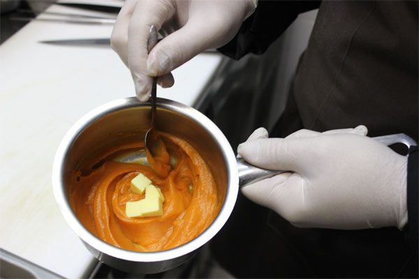 Подготовленные овощные пюре (морковное и из зеленого горошка) прогреть со сливочным маслом.