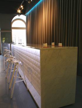 Дизайнер проекта – Евгений Скориков. В основе дизайна – минимализм, ключевые цвета – белый и зеленый. Пространство торгового зала эффективно расширяется за счет зеркал. В использовании зеркал, зонировании и сложном освещении есть и еще одна задумка. Простое и понятное пространство сделать более сложным, создавая своего рода визуальный лабиринт. К тому же это позволяет более эффективно интегрировать одну зону в другую. Дизайнерской задумке отлично отвечает мебель: футуристичные мягкие диваны, собранные из отдельных модулей, концептуальные итальянские стулья, словно из ломаных линий, и необычные столики с каменными подстольями.