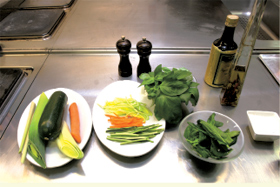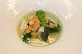 При подборе ингредиентов здесь возможны варианты: для супа можно взять филе лосося или семги, си-баса чилийского или французского, судака, креветки, мидии. Основной овощной ингредиент - свежий шпинат, который хорошо сочетается с морепродуктами. Также я использую лук-порей, жюльен из моркови и цукини, свежий базилик. Небольшое количество лимонника придаст супу интересную вкусовую нотку и более насыщенный цвет.