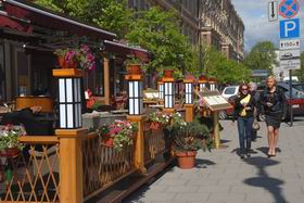 - Уличное кафе на центральных проспектах должно внешне соответствовать архитектурному облику города и конкретно того здания, рядом с которым находится, - рассказывает Екатерина Васильева, специалист по связям с общественностью «Гранд Отеля Европа». – Кстати, это не просто наше мнение, а еще и требование, предъявляемое городской администрацией к заведениям такого формата. Кроме того, кафе под открытым небом - еще и визитная карточка объекта, которому принадлежит. И мы рассматриваем нашу уличную террасу именно как наружную рекламу отеля и всех его ресторанов. А поскольку наш отель пятизвездочный, облик террасы должен быть такого же уровня.