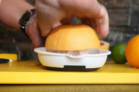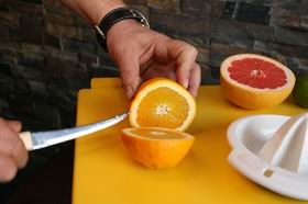 Грейпфрут точно так же разрезать пополам, выжать сок, отмерить 25 мл и тоже вылить в шампанское блюдце.