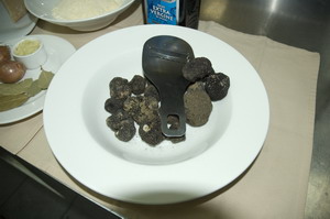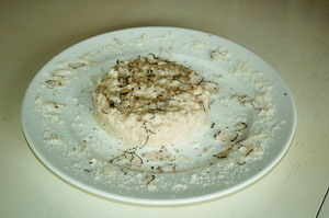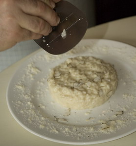 Выложить ризотто на тарелку через кольцо и легонько хлопнуть по тарелке снизу: по-итальянски это называется «алл'онда» – «на волне» – по ризотто должна пройти волна. Именно эта волна – знак качества блюда. Посыпать тертым трюфелем.