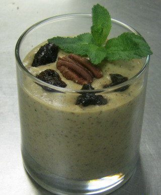 Все ингредиенты смешать в блендере. Украсить листиком мяты, цельным орехом и черносливом.