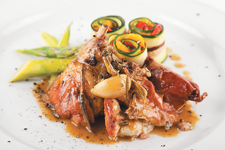 ■ Из ножки кролика удалить часть кости, фаршировать ножку панчеттой и салом с добавлением чеснока и розмарина.