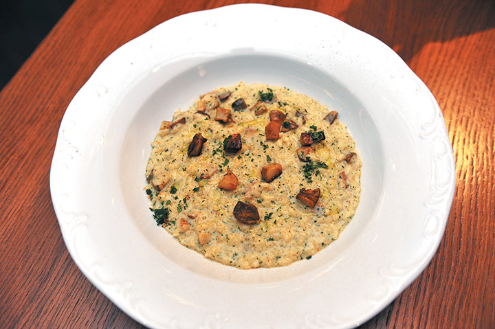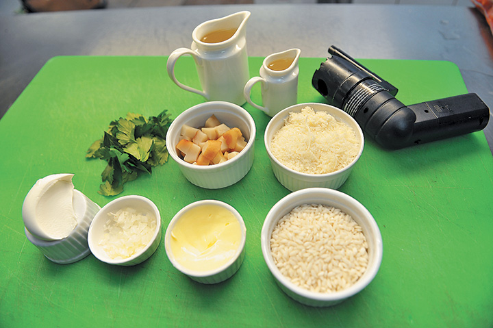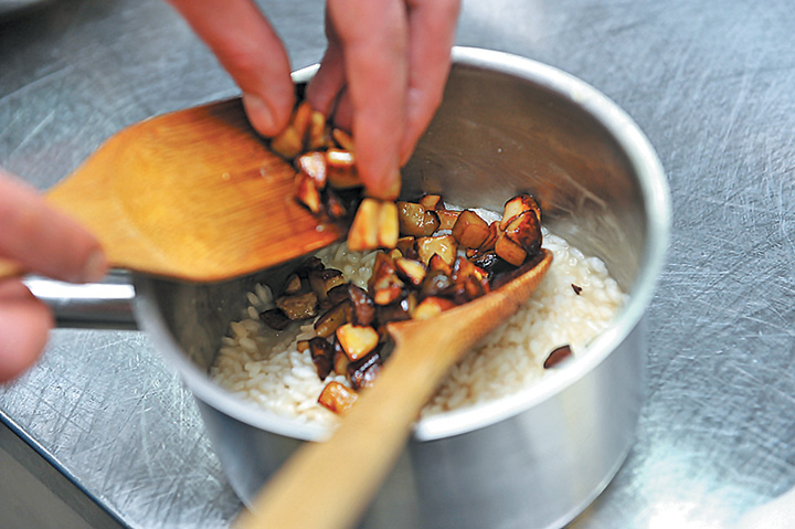 В сухой сотейник высыпать рис и хорошо прогреть (без изменения цвета). Добавить оливковое масло, пасту из лука и чеснока, через минуту — белое вино, выпарить. Таким образом каждая рисинка образует капсулу и при дальнейшей обработке сохранит форму.