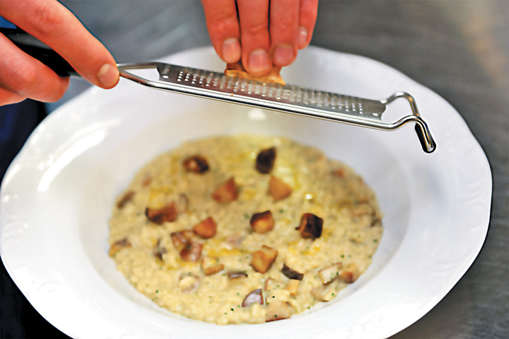 Постепенно, по частям (это очень важно!) добавлять бульон и на медленном огне продолжать приготовление, периодически помешивая.