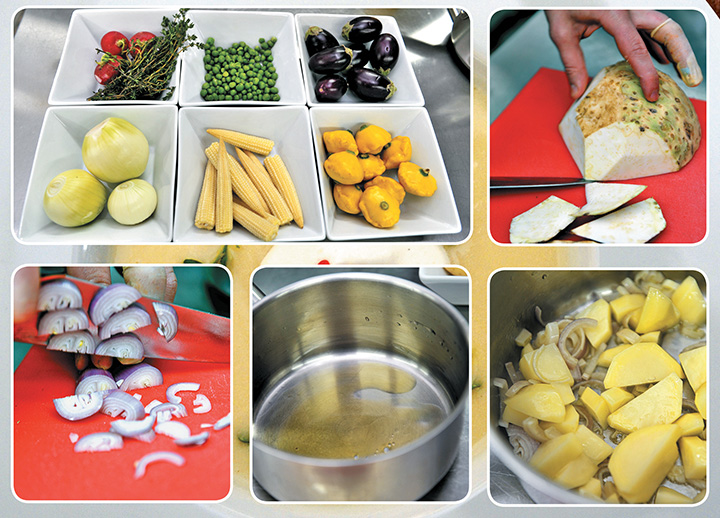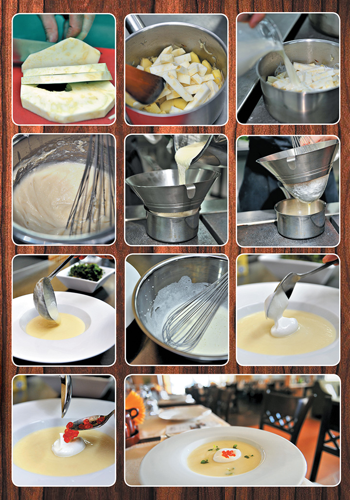 В сотейник налить растительное масло, добавить лук и картофель, обжарить вместе, но не зажаривать — чтобы не потеряли цвет. Добавить сельдерей, влить молоко. Варить до готовности овощей.
