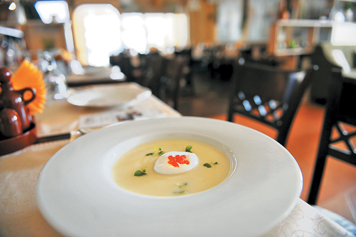 В охлаждённой миске взбить сливки, выложить на суп сверху. На взбитые сливки выложить икру лосося, декорировать ростками хрена.