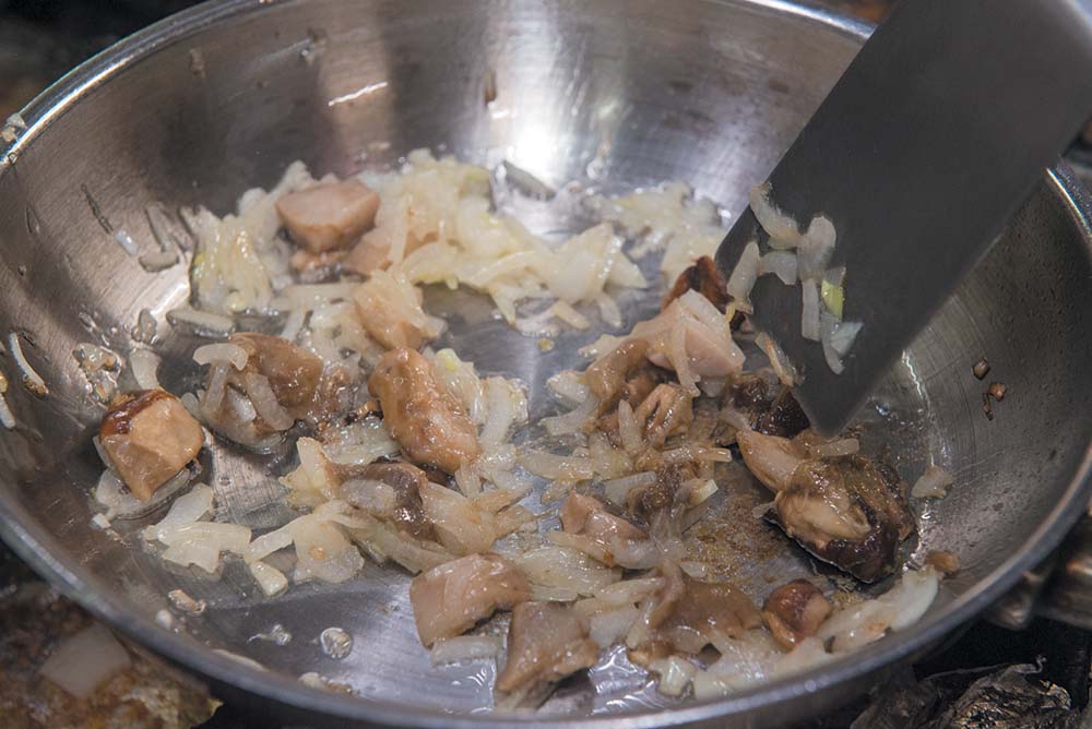 Обжарить репчатый лук и белые грибы. Добавить к ним мясо, хорошенько обжарить. Затем добавить сливки и соленые огурцы. Протушить, заправить солью и перцем.
