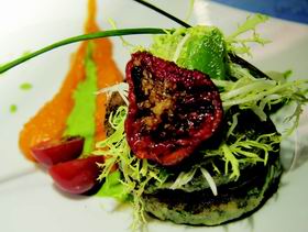6. Сборка блюда. На тарелку наносится рисунок зеленым соусом из петрушки. Выкладывается первая котлетка из цукини, сверху – обжаренный репчатый лук, затем – вторая котлетка. Рядом создается рисунок с использованием пюре из картофеля и моркови и крем-соуса из петрушки. Блюдо украшается кресс-салатом, лопатками горошка, помидорами черри, палочками лука шнит и вяленым томатом.