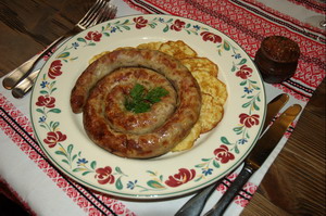 Украинская колбаска – одно из самых популярных блюд этой национальной кухни. Делается она заранее, поскольку фарш должен настояться. Подавать ее можно как в горячем, так и в холодном виде, и если хранить при этом в смальце – растопленном сале, - то колбаска через некоторое время станет еще вкуснее, набираясь вкуса и аромата. В холодном виде ее можно подавать с хлебом, горчицей и хреном, а в горячем – например, с драниками.