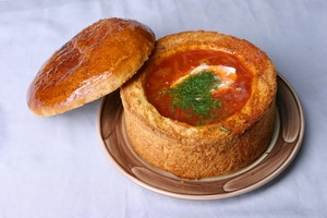 Разновидностей борща на Украине очень много, и в ресторанах все они представлены быть не могут. Светлана на кухне своего заведения готовит семь видов борща, из которых для представления в нашем журнале выбрала наиболее яркий – классический украинский в хлебе.