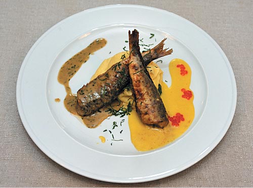 Для ресторанной подачи шеф-повар Иннокентий Регентов несколько усложнил традиционное шведское блюдо Stekt stromming — филе салаки с картофельным пюре и моченой брусникой, - добавив в него сразу два соуса — холодный голландский и горячий грибной.