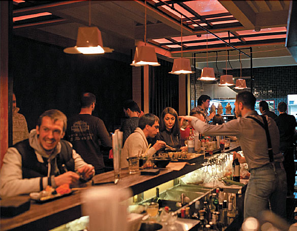 — У нас есть две категории гостей, — объясняет Дмитрий Шуршаков, шеф-повар и совладелец гастробара «Никуда не едем». — Первая — люди, приходящие примерно часам к шести вечера. Их «раскручивать» на еду не надо: им надо хорошо поесть — поужинать — и столь же хорошо выпить. Вторая — гости, приезжающие к десяти вечера, которые уже успели где-то поужинать. Их больше интересует вторая часть нашего гастробара — Сашина (Александра Кана, бармена и второго владельца — ред.), — то есть напитки и хорошее времяпрепровождение. Для них предполагается раздел пирогов, брускетт — вернее, даже не брускетт, а скандинавских сморребродов, которые представляют из себя кусок хлеба с начинкой, который режется в зависимости от числа гостей на четыре, шесть, восемь частей. Они пользуются гигантской популярностью! Поэтому даже на те столы, где сидят люди, которые пришли просто выпить, в любом случае попадает какая-то еда.