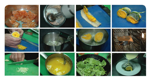 Заранее приготовить муслин из норвежского лосося и шафрана. Для этого все ингредиенты взбить в однородную массу.