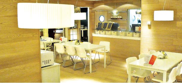 Раздаточную линию мы дополняем станциями публичного приготовления блюд в зале, где на глазах у посетителя готовят омлеты, пасты, азиатские блюда (на воках), рыбу и мясо на гриле. Очередей помогают избежать несколько кассовых модулей.