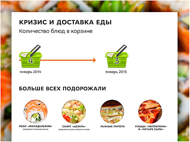Как показали исследования, проведённые нашим отделом аналитики, в Москве средний чек за январь 2014 года составил 1481, 94 рубля, а в январе нынешнего — 1410, 09. В регионах размер среднего чека снизился с 934,50 рубля в прошлом году до 922,42 в нынешнем. Сравнительный анализ показывает, что столичный рынок доставки еды в первый месяц текущего года упал на 5%, а региональный — на 1,3. Среднее количество заказываемых блюд уменьшилось с четырёх до трёх.