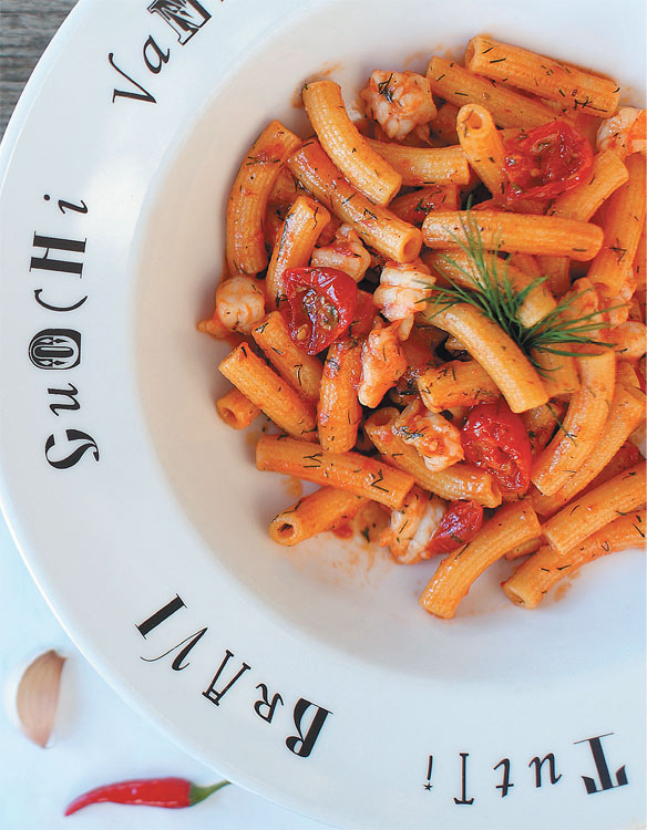 Паста подаётся с соусом на основе сливочного масла с добавлением томатного соуса, рубленого укропа и креветок, обжаренных на оливковом масле с анисовой настойкой (20 г, при обжаривании весь алкоголь выпаривается, оставляя лёгкий анисовый аромат). В блюдо добавляются вяленые домашние помидоры черри. Украсить веточкой укропа.