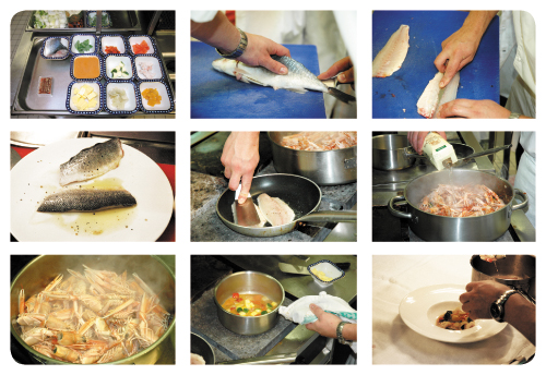 Собрать блюдо. Для этого выложить получившуюся смесь из овощей, хвостов лангустинов на четыре тарелки, сверху положить готового морского окуня. Можно подавать!