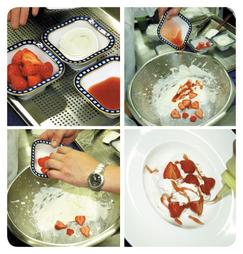 Покрошить меренги на мелкие кусочки, добавить во взбитые сливки с половиной клубничного пюре. Не смешивать слишком тщательно!